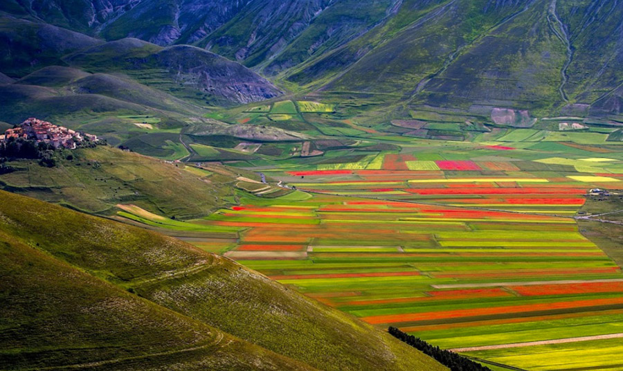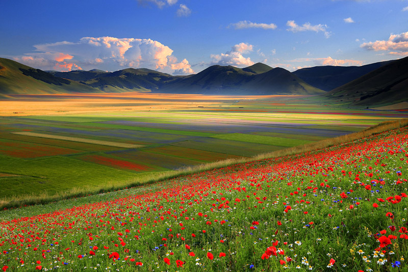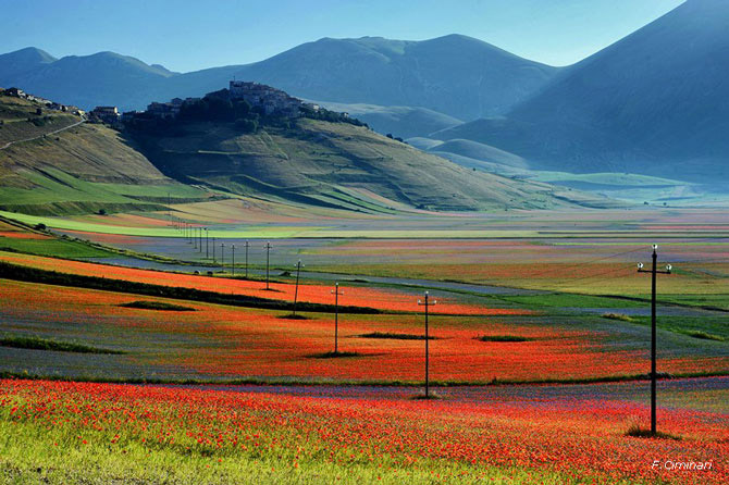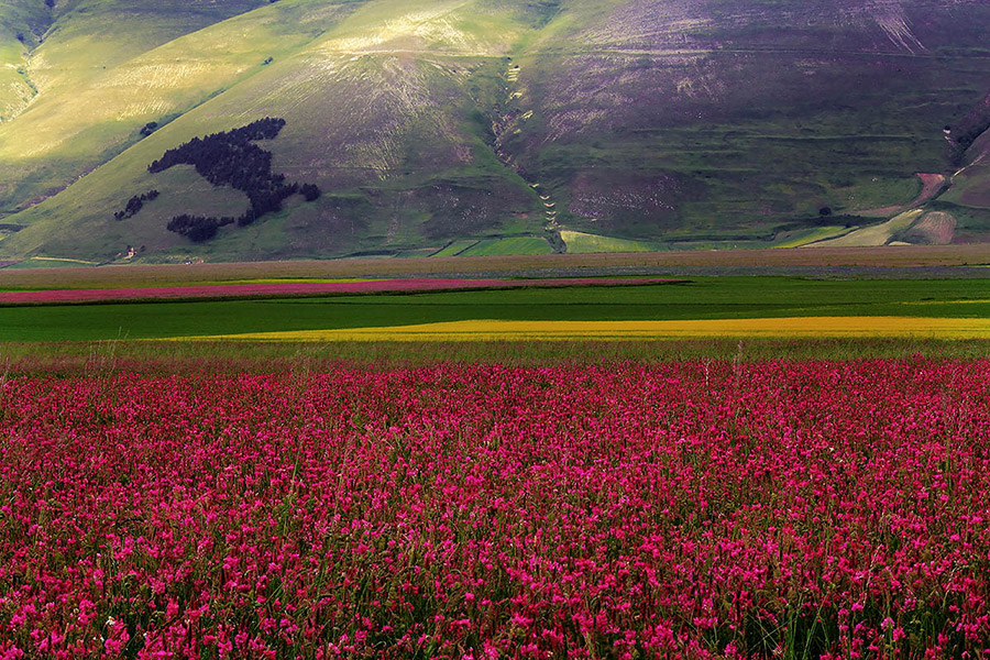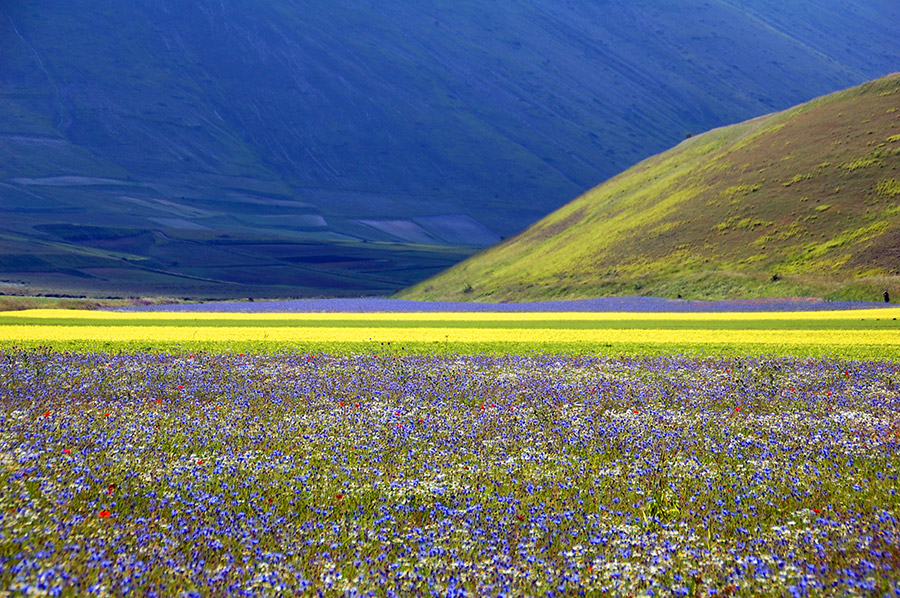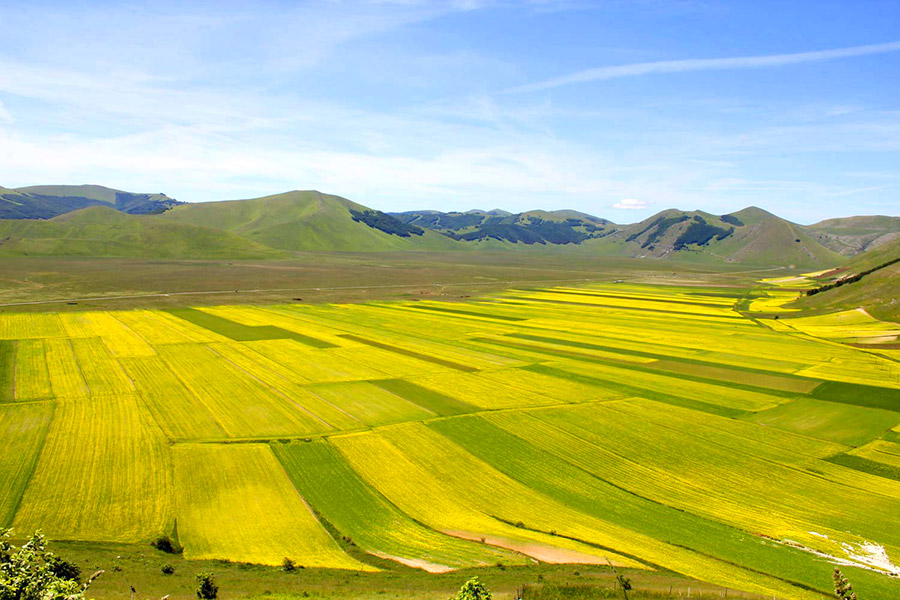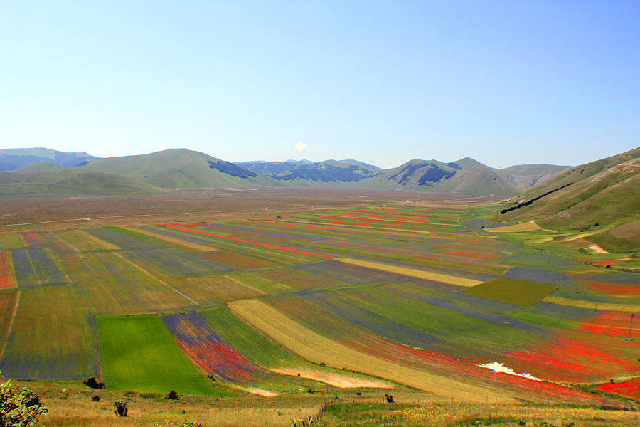 Trasferimento a Castelluccio di Norcia, dove tra fine maggio e i primi giorni di luglio, l'altopiano di Castelluccio è testimone di un evento di particolare importanza, La Fioritura: per diverse settimane la monotonia cromatica del pascolo, viene spezzata da un mosaico di colori, con variazioni di toni che vanno dal giallo ocra al rosso. La festa della "Fiorita" ricade nella terza e nell' ultima domenica di Giugno, ma non esiste un preciso giorno per ammirare questo incantevole spettacolo, ogni anno tutto è affidato all'andamento climatico della stagione. Le specie floreali che tingono il Pian Grande e il Pian Perduto in questo periodo sono innumerevoli e camminando lungo i sentieri si possono incontrare: genzianelle, narcisi, violette, papaveri, ranuncoli, asfodeli, viola Eugeniae, trifogli, acetoselle e tant'altro. In serata raggiungimento di Cascia e sistemazione in hotel nelle camere riservate, cena e pernottamento (hotel Monte Meraviglia - cat 3 stelle).